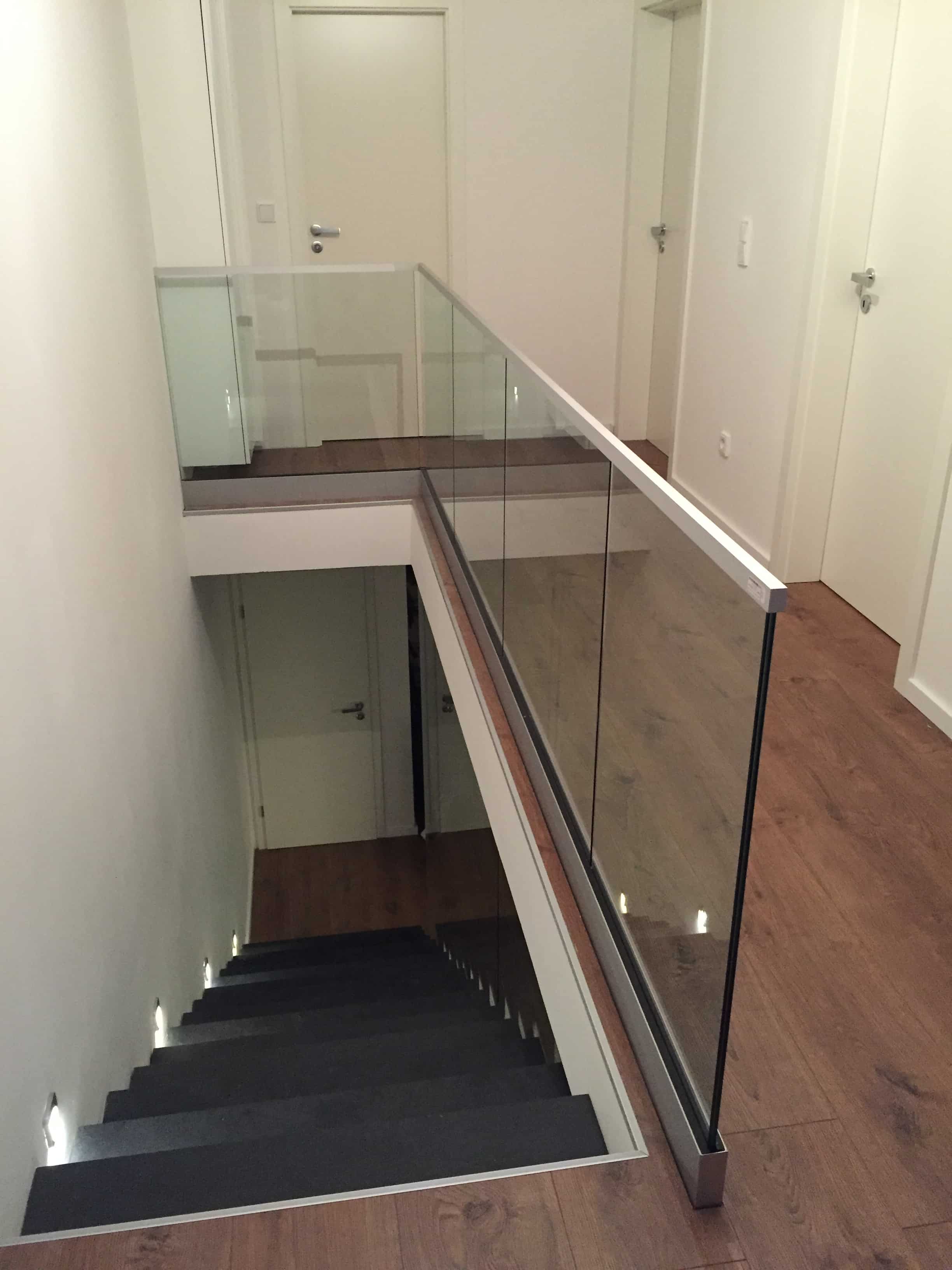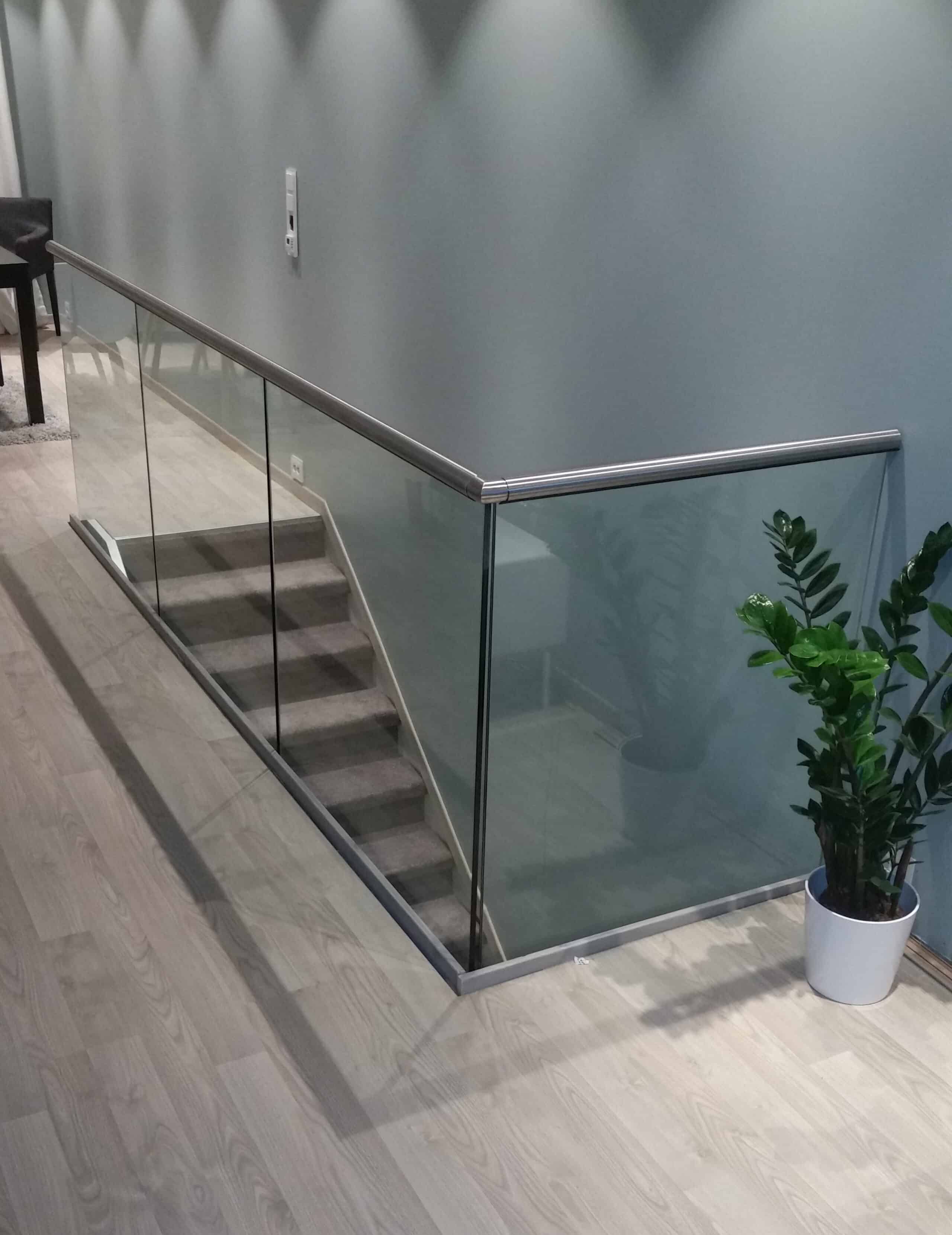 - Glas fastgjort med skinner eller punktbeslag direkte i trappen