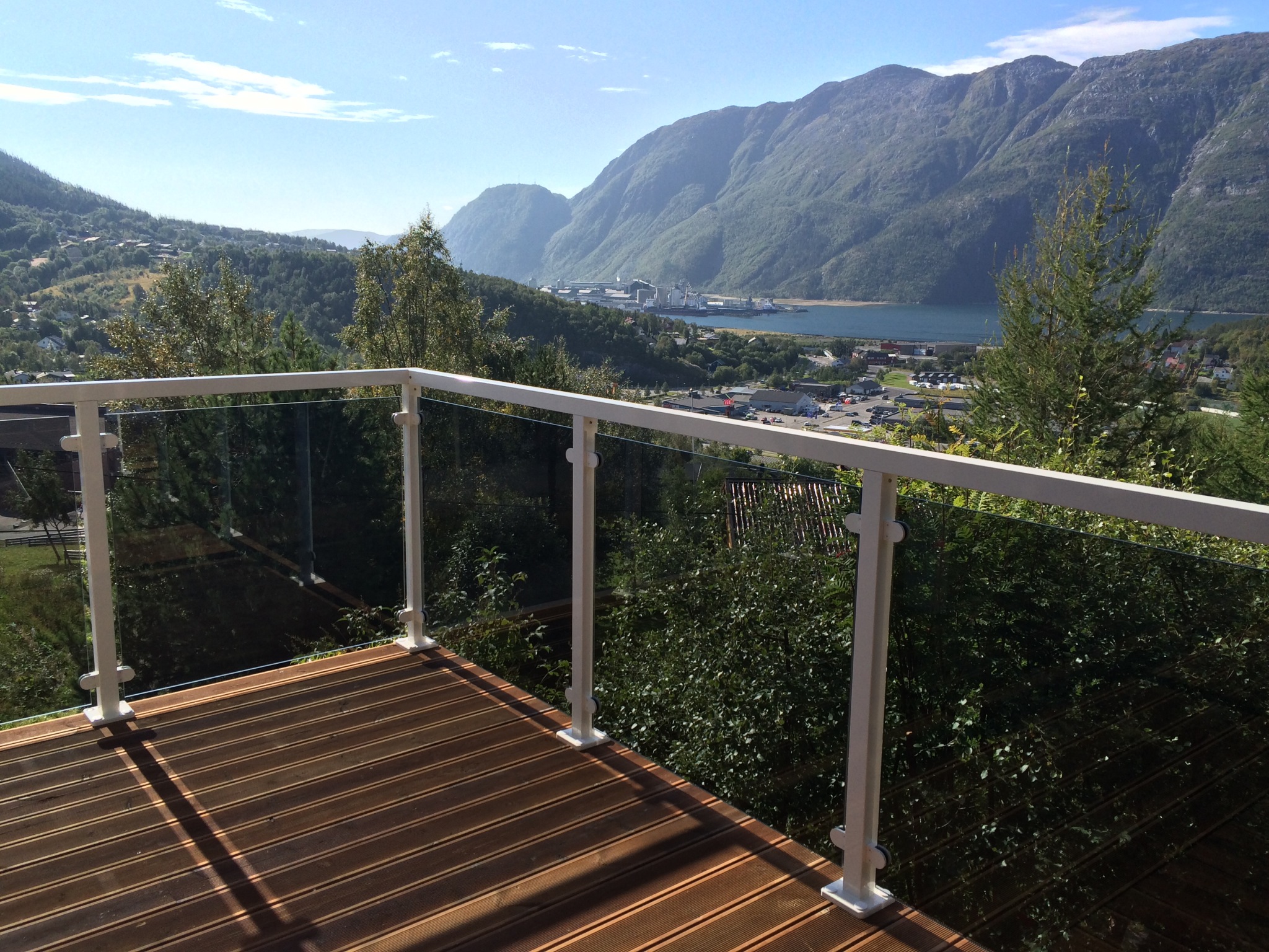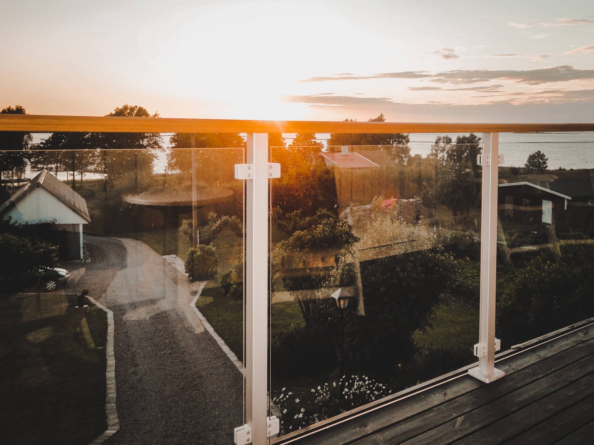 Rækværket fremstilles efter dine mål og leveres som en komplet byggesæt med alt, du har brug for. Glaspanelerne skaber et åbent udtryk og lader lyset strømme ind, mens konstruktionen i pulverlakeret aluminium er stærk og modstandsdygtig over for vind og vejr.