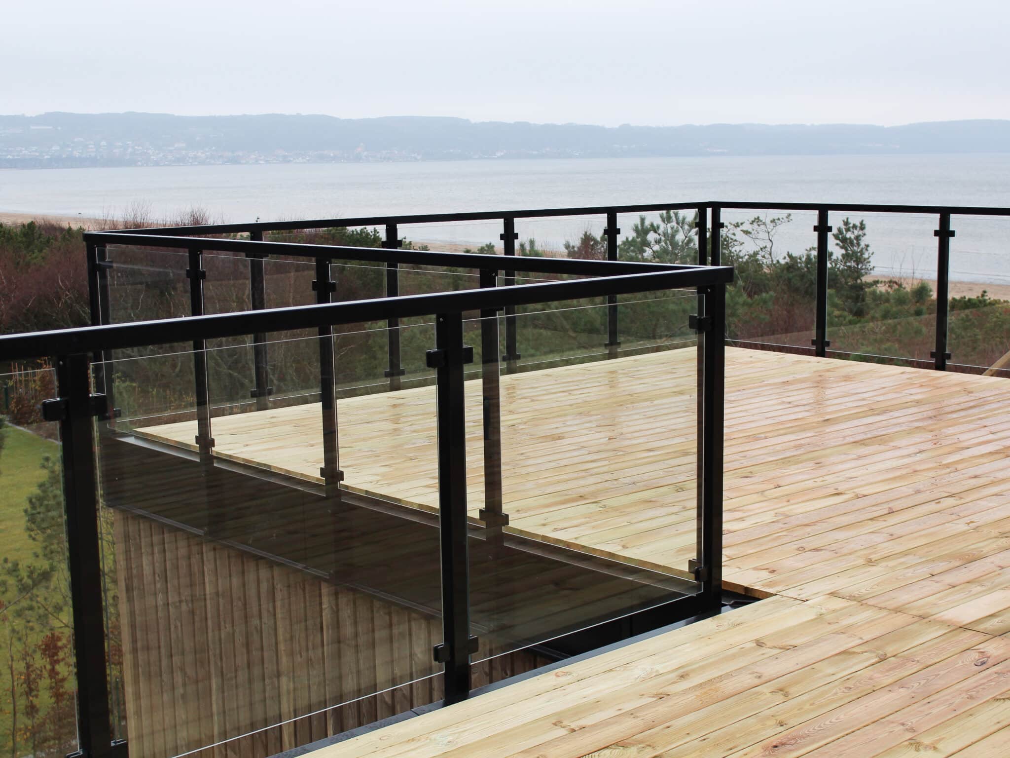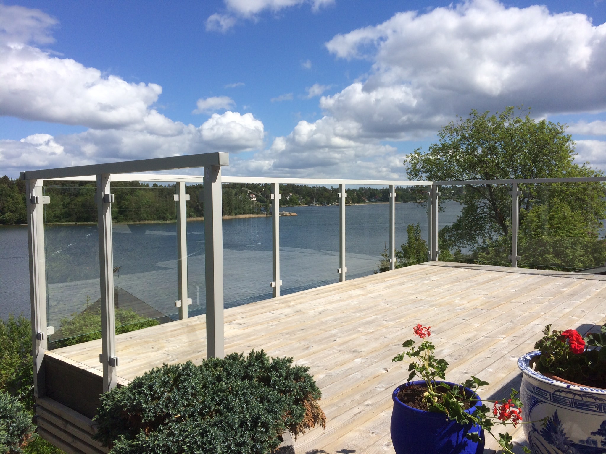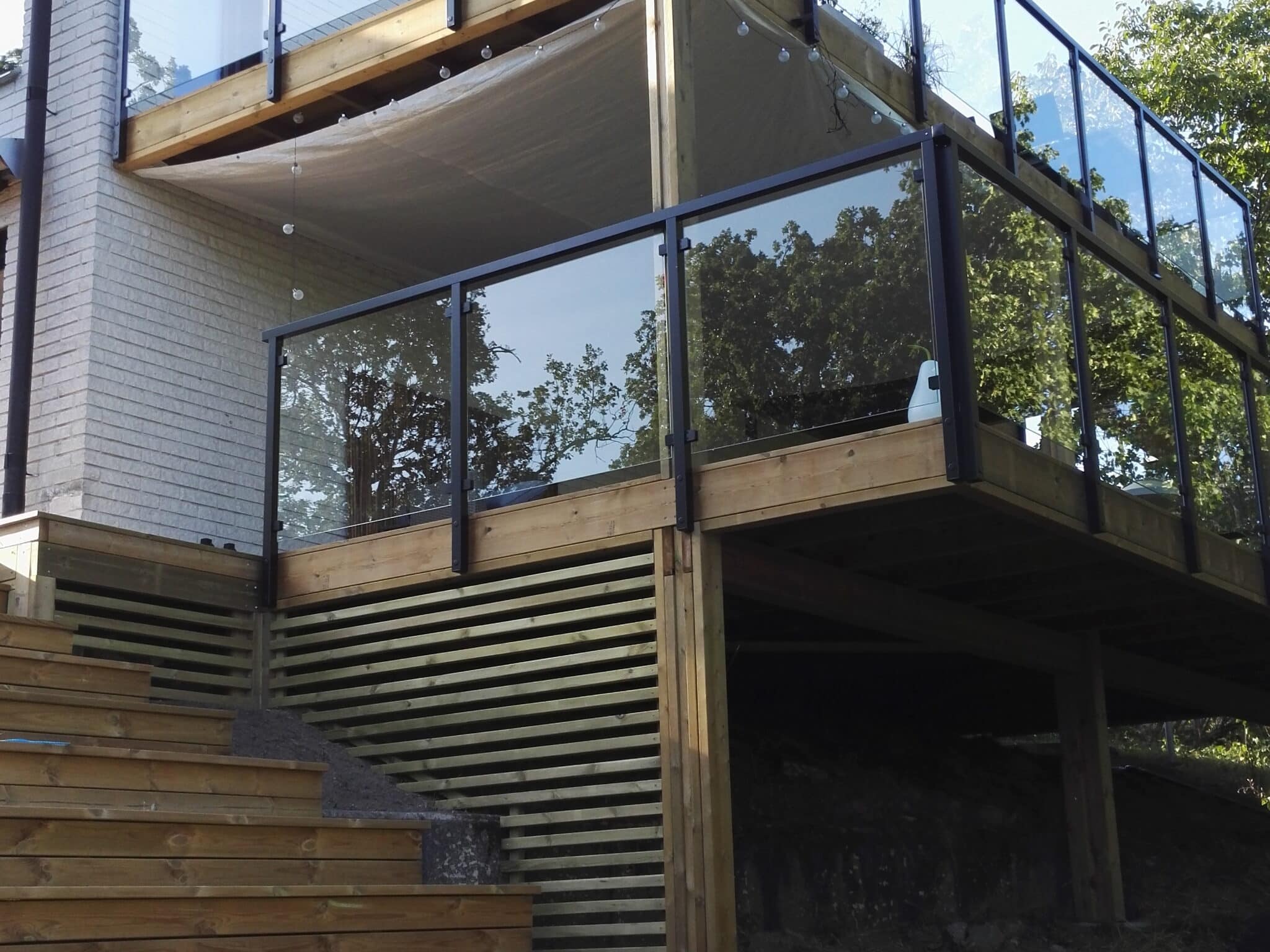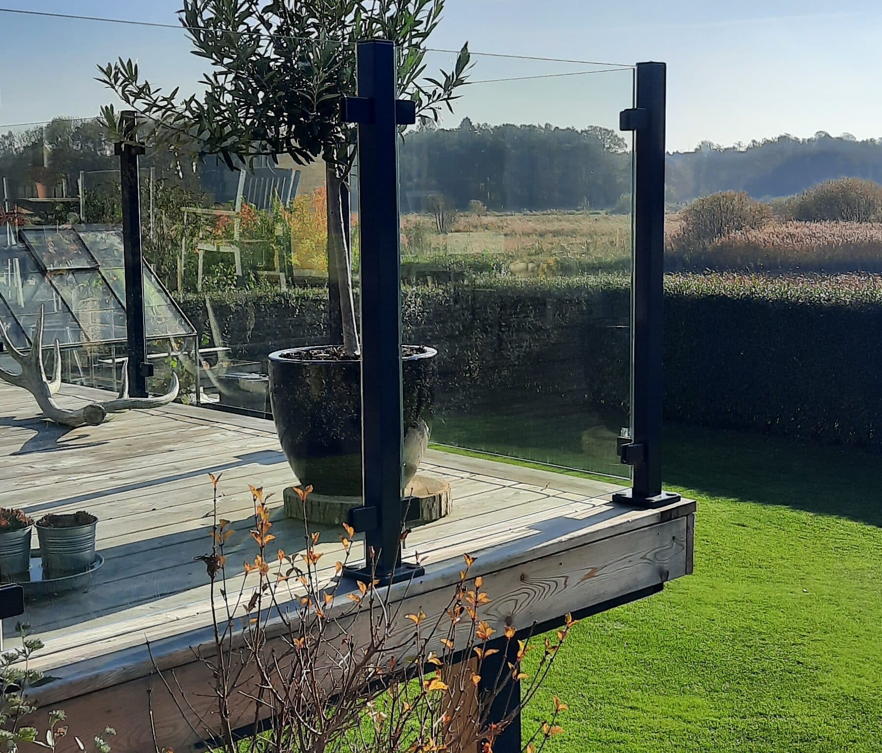Alle vores glas er laminerede sikkerhedsglas på 8,76 mm med slebne og polerede kanter. Til ekstra udsatte områder anvender vi hærdet lamineret glas – altid standard for vindskærme.