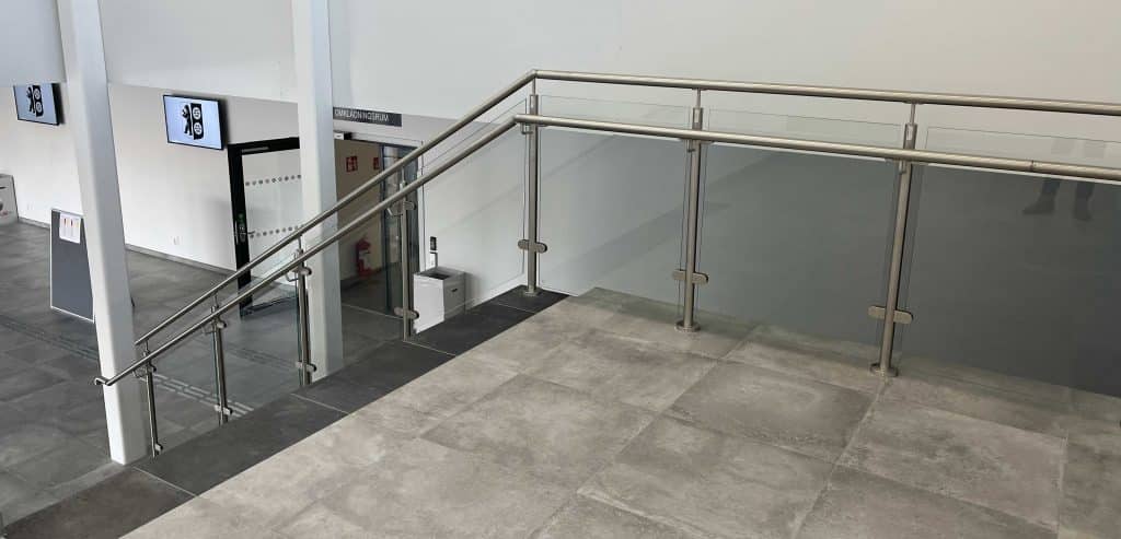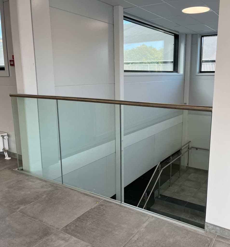 - 32 m gelænder med skråskåret glas 8,76 mm med rustfri overligger og en ekstra håndliste med højde på 900 mm.