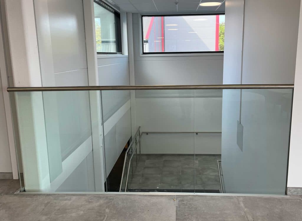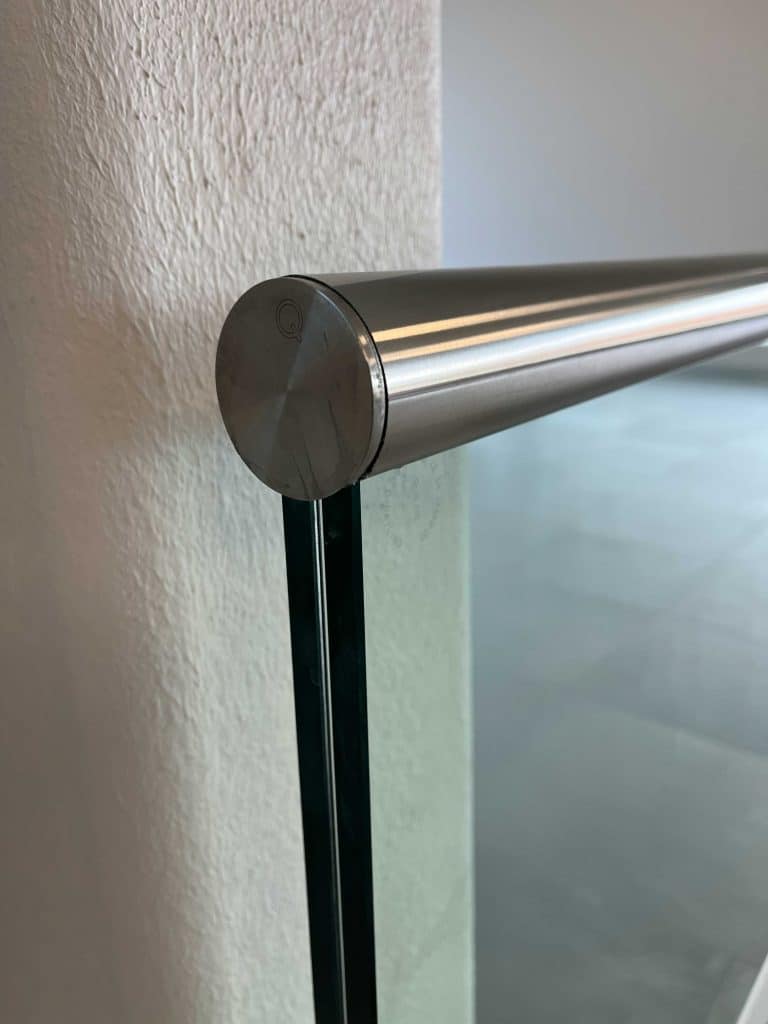 Gelænderets glas består af et hærdet og lamineret glas på 12,76 mm med slebne og polerede kanter, dette gør glasset meget stærkt og holdbart. Med lamineret glas menes, at to glasplader er limmet sammen med en plastfilm imellem dem.