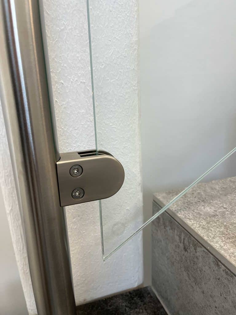 - Gulvbeslag: Hvert glasstykke fæstnes i to gulvbeslag i aluminium – enten uden på eller oven på underlaget.